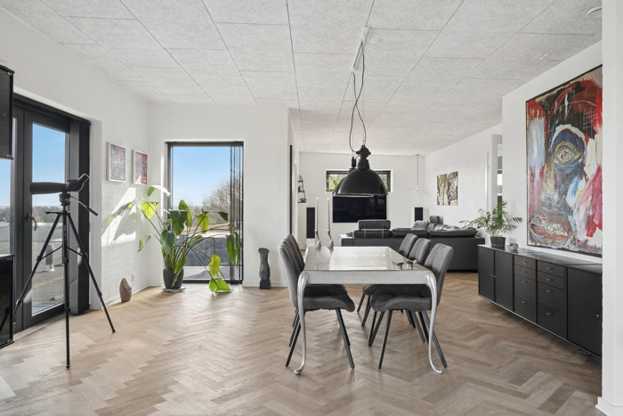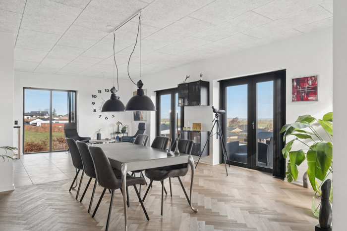 Indenfor åbner boligen sig med hele 234 veldisponerede kvadratmeter, hvor lys, udsigt og rumfornemmelse er i fokus. På førstesalen finder du det imponerende køkken/alrum og stue, hvor store vinduespartier trækker fjorden og landskabet helt ind i rummet. Her ændrer udsigten karakter med årstiderne, og lyset bevæger sig smukt gennem dagen. Det er et naturligt samlingspunkt med god plads til både hverdagsliv og gæster.