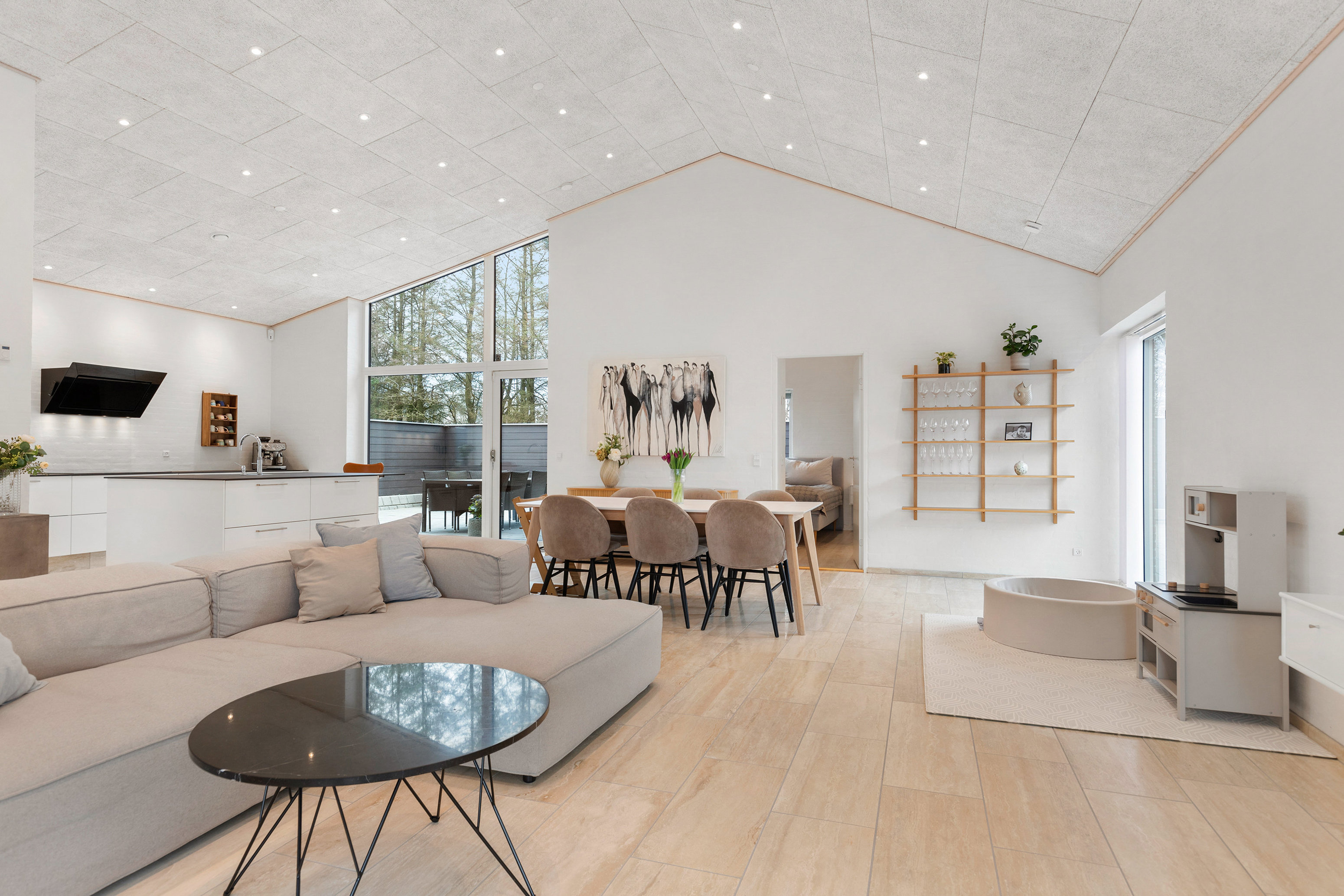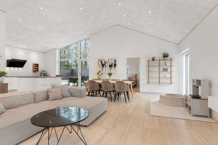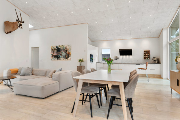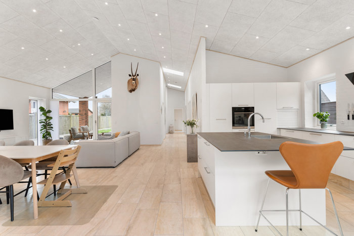 Boligens naturlige samlingspunkt er det store køkken/alrum og stueområde, som ligger i åben forbindelse. Her oplever du en flot rumfornemmelse med god loftshøjde, et skønt lysindfald fra de store vinduespartier og en behagelig sammenhæng mellem inde og ude.