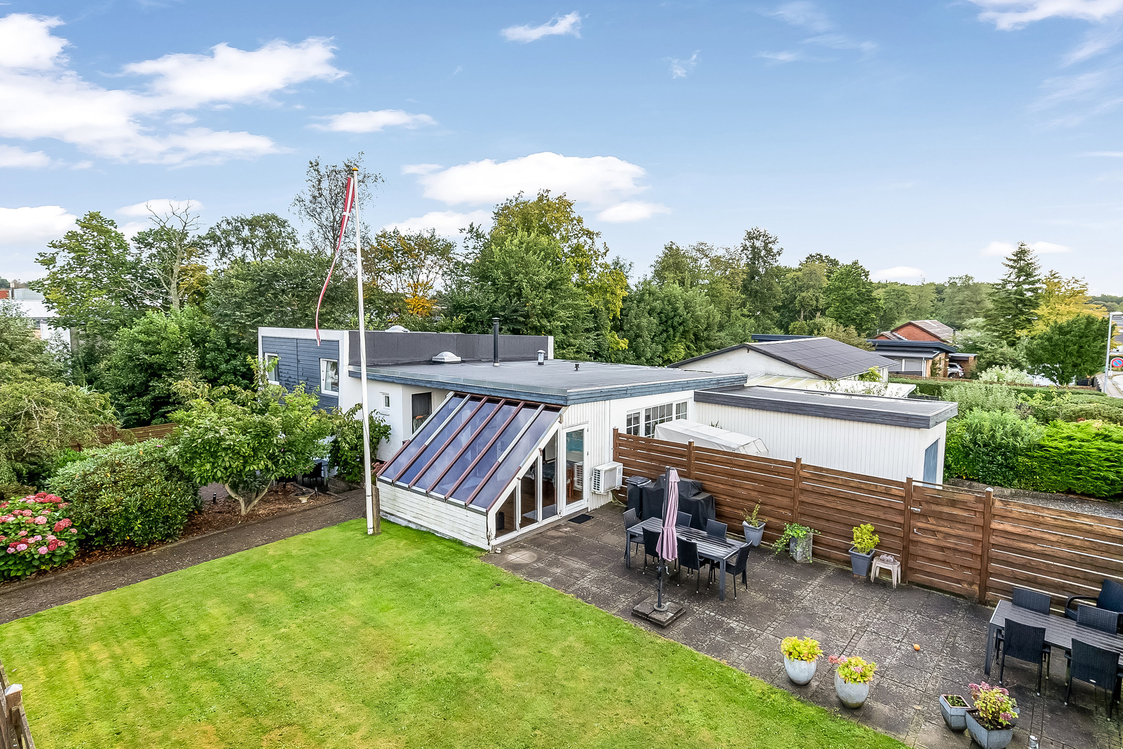 Udefra fremstår villaen indbydende med sin hvide facade. Fra gadesiden er der adgang til garagen samt et ekstra flisebelagt område. Baghaven byder på nem og overskuelig have med flere solrige terrasseområder, hvor der er gode muligheder for både afslapning, udeliv og leg. Taget er udskiftet i ca. 2022. Træpilleovn er fra 2018 og vinduerne er løbende udskiftet.