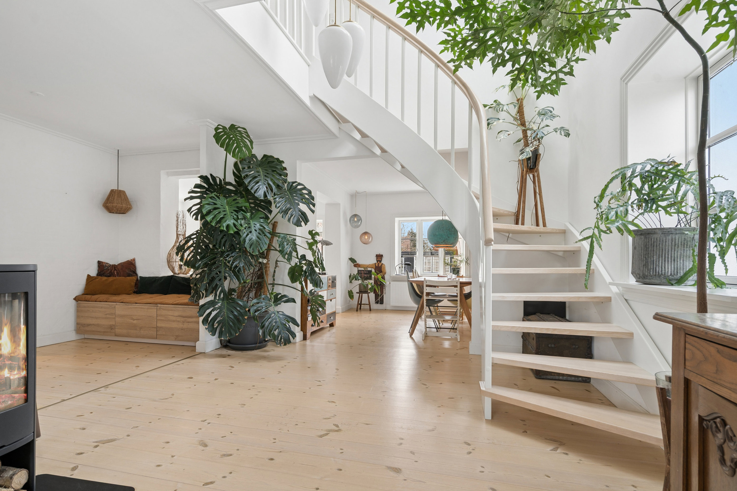 Huset indeholder: Elegante køkken med gulvvarme. Fra køkkenet er der et behageligt rumforløb til alrum og stue, og stueplanet byder desuden også på et toilet samt et funktionelt bryggers. Den lyse og lette atmosfære fortsætter videre på førstesalen, der har fritlagte hanebånd, og som fordeler sig over tre forrygende værelser samt et lækkert badeværelse med brus og gulvvarme.